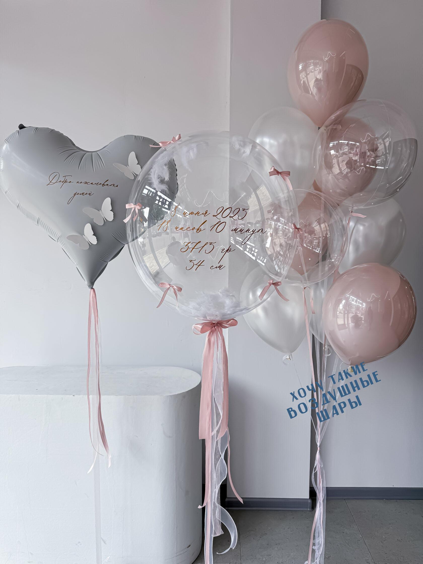 "Счастье" набор на выписку премиум ( номер 88) Состав набора: Сердце с надписью на атласных лентах и декором бабочки Прозрачный большой моно шар с индивидуальной надписью и бантами на лентах Связка воздушных шаров микс ( двойные стеклянные шары, прозрачные баблс, жемжчужный хром) Бережно доставляем в транспортировочных пакетах Доставка набора - бесплатно!